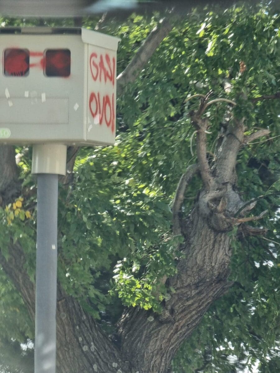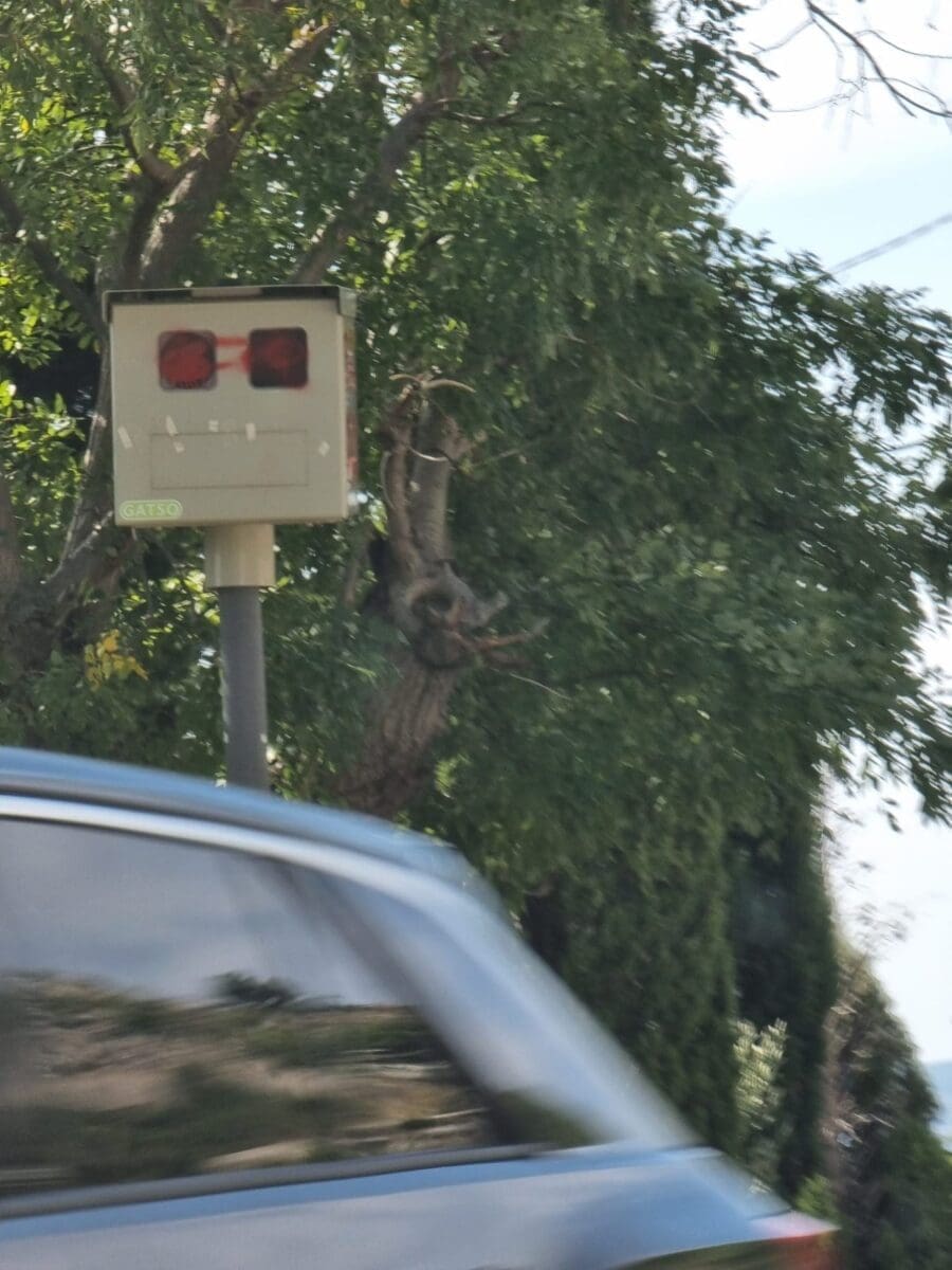 Naš čitatelj (podaci poznati redakciji portala Dalmacija Danas) ustupio nam je na korištenje fotografije snimljene na Staroj kliškoj cesti. Fiksna kamera za mjerenje brzine, odnosno kutija u kojoj se nalazi kamera, išarana je crvenim sprejem.