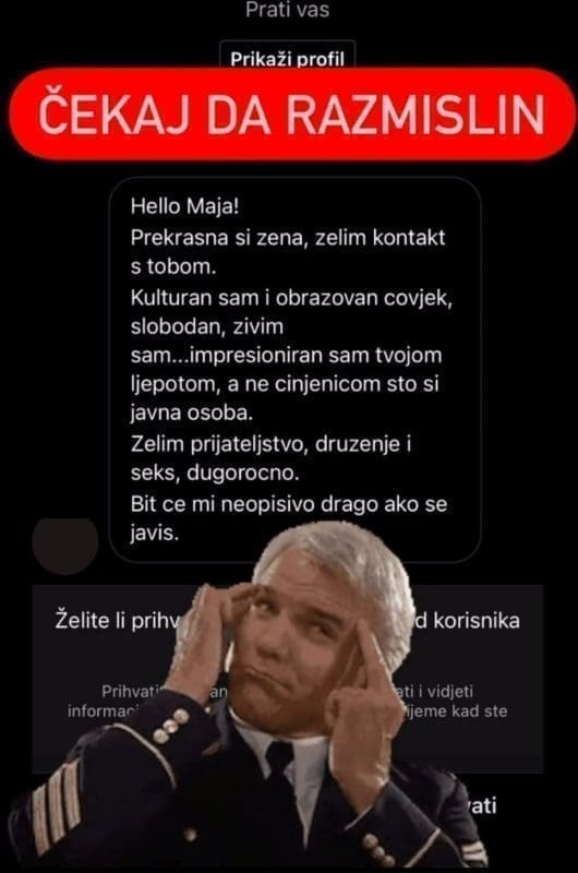 U poruci je napisao sljedeće: Hello Maja! Prekrasna si žena, želim kontakt s tobom. Kulturan sam i obrazovan čovjek, živim sam... impresioniran sam tvojom ljepotom, a ne činjenicom što si javna osoba. Želim prijateljstvo, druženje, seks, dugoročno. Bit će mi neopisivo drago ako se javiš.
