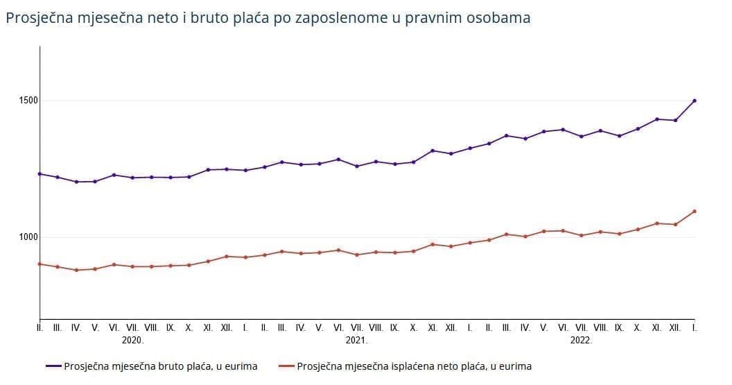Prosječna mjesečna isplaćena neto plaća po zaposlenome u pravnim osobama Republike Hrvatske za siječanj 2023. iznosila je 1 094 eura, što je nominalno i realno više za 4,6% u odnosu na prosinac 2022, podaci su Državnog zavoda za statistiku.