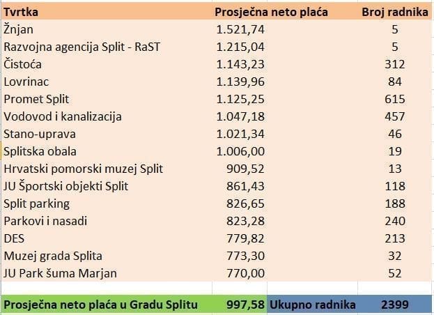 Tvrtke i ustanove u vlasništvu ili većinskom vlasništvu Grada Splita prilično dobro prate državni trend isplate neto plaće. Za siječanj ona iznosi 997,58 eura, a odnosi se na 2399 zaposlenih.