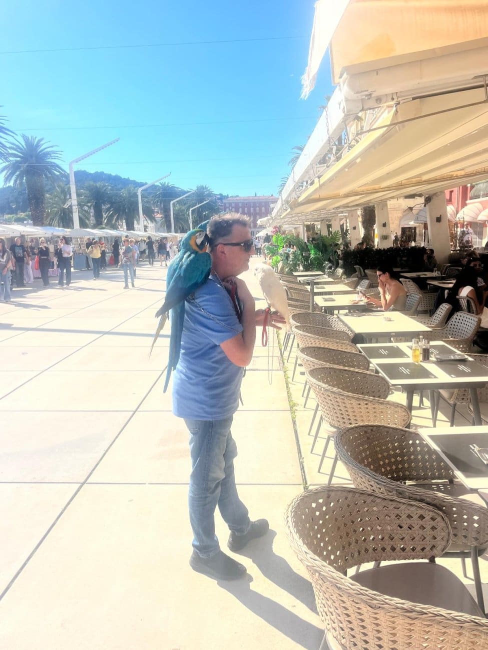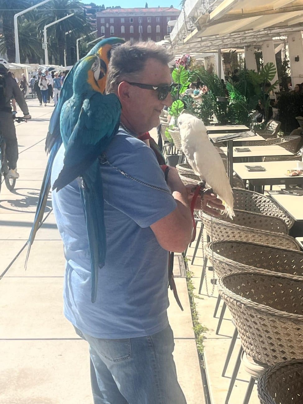 Šarene ptice – dvije plavo-žute, treća crveno-zelena te četvrta bijela – mirno su sjedile na njegovim rukama i ramenima, povremeno šireći krila i dodatno plijeneći poglede prolaznika. Mnogi su zastajali kako bi fotografirali ovaj neobičan prizor, dok su se neki i kratko zadržali u razgovoru s vlasnikom.