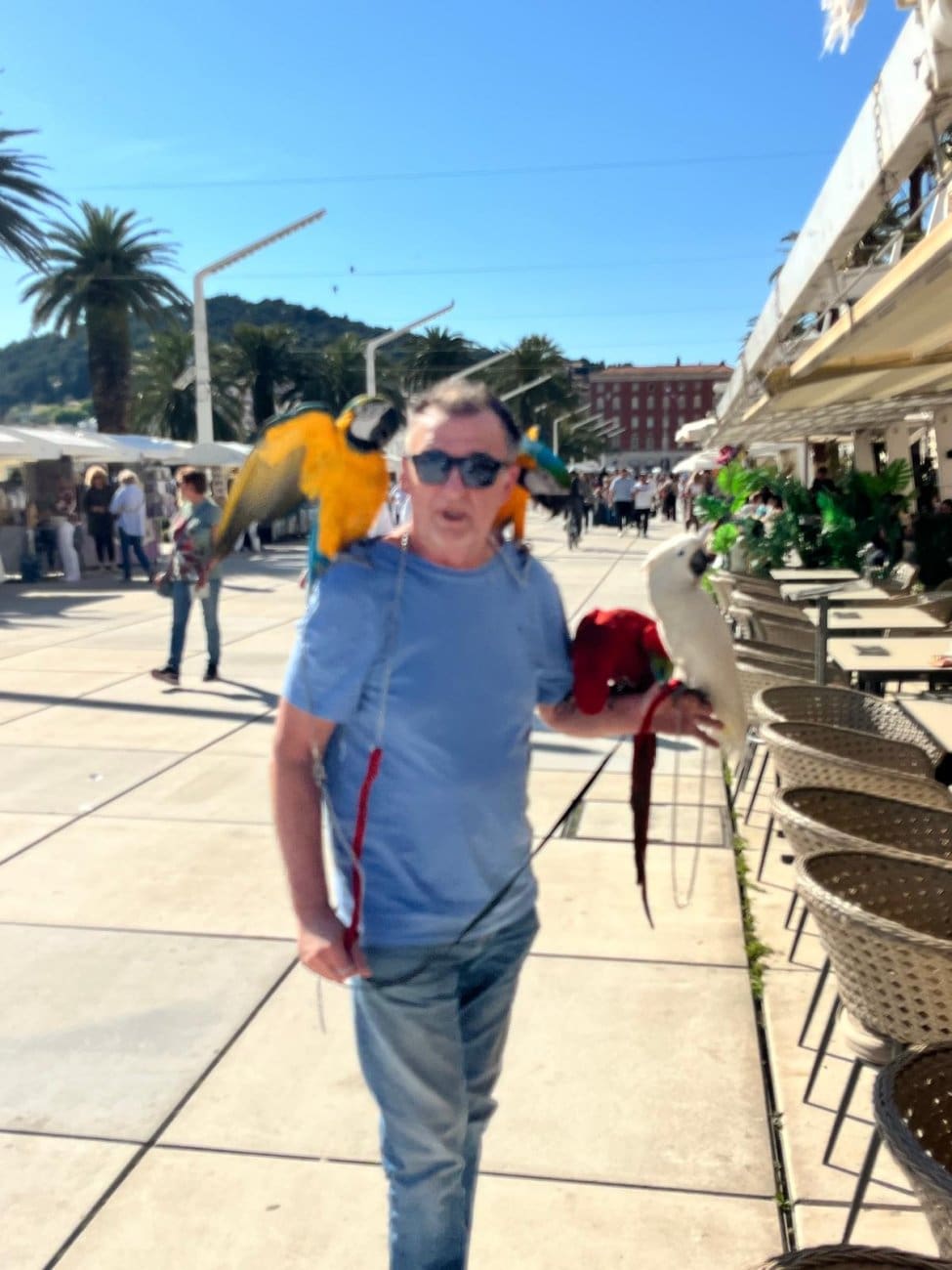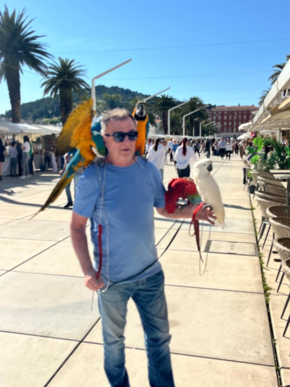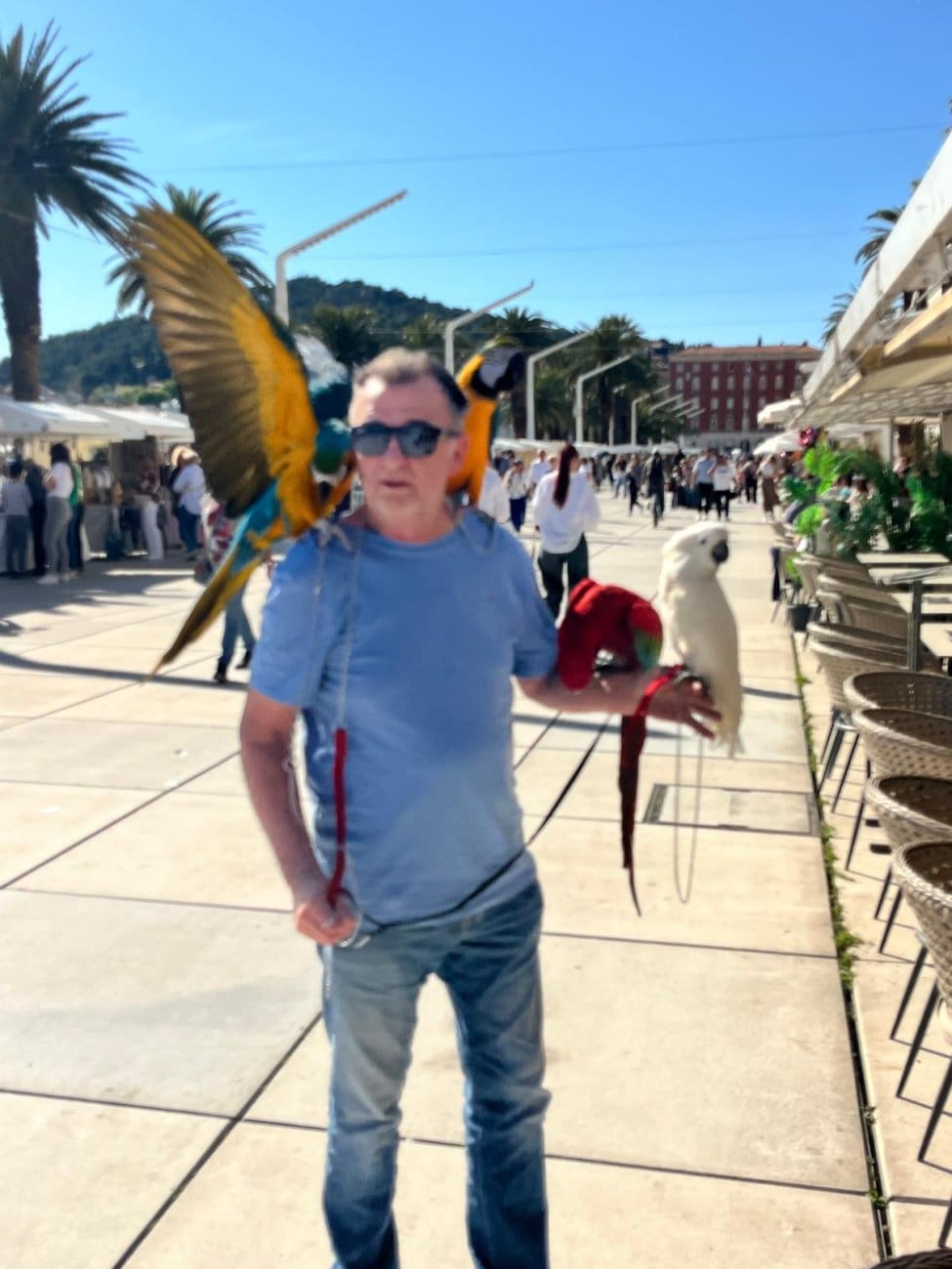 Današnje prijepodne na splitskoj Rivi obilježio je nesvakidašnji prizor koji je privukao pažnju brojnih šetača i turista. Muškarac u opuštenoj odjeći prošetao je rivom u društvu čak četiri papige, izazvavši znatiželju i oduševljenje okupljenih.