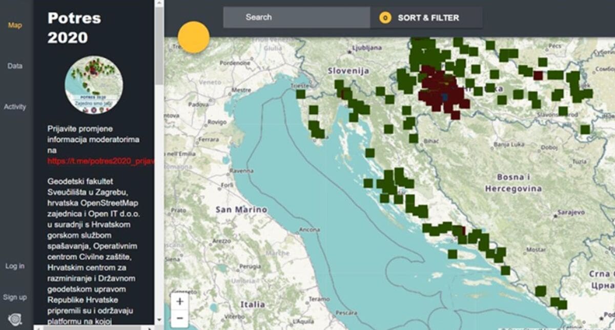 Geodetski fakultet Sveučilišta u Zagrebu, hrvatska OpenStreetMap zajednica i Open IT d.o.o. u suradnji s Hrvatskom gorskom službom spašavanja, Operativnim centrom Civilne zaštite i Državnom geodetskom upravom Republike Hrvatske pripremili su i održavaju interaktivnu digitalnu kartu Potres 2020 za pomoć stradalima u potresom pogođenim područjima. Na njoj se najbrže i najjednostavnije može vidjeti kome je od unesrećenih potrebna pomoć, a može ju se i zatražiti. Na karti je moguće na jednostavan način dodati georeferencirane informacije u nekoliko standardiziranih kategorija: ‘nudim pomoć’, ‘tražim pomoć’, ‘potraga za nestalima’, ‘zbrinjavanje ljudi i životinja’, ‘opksrbni punkt’, ‘smještaj’, ‘plin-voda-struja-telekomunikacije’, ‘promet-parking’, ‘hitne službe’.