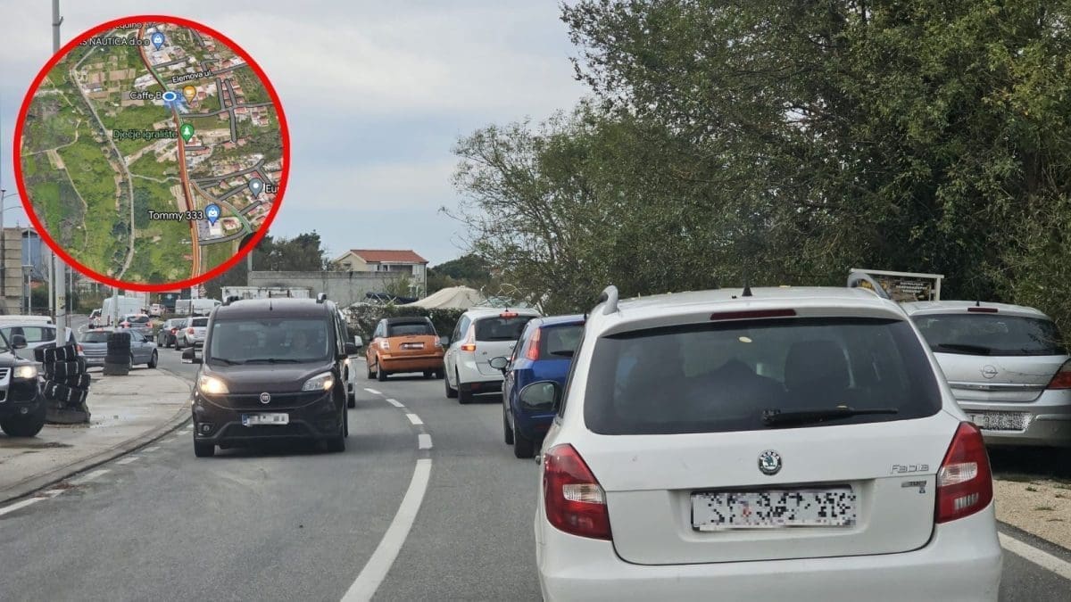 Dužina kolone trenutno je oko tri kilometra i vozači se kreću "mic po mic". Radi se o cesti koja vodi u ili iz Žrnovnice, a za izaći na magistralu čeka se više od pola sata.