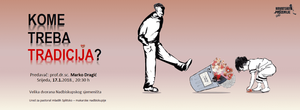 Mislite da su narodno nasljeđe samo terluci, opanci, pegle od 30 kila, 350 stupnjeva kraj šporeta i kazan u kojemu se kuha pola krave? Mislite da pojam "narodna baština" podrazumijeva samo klapska grla natopljena bevandom i gusle u Drnišu za Dan pobjede? U tom ste slučaju visoko na površini i previše ste urbani. Što je tradicija? Što su to narodni običaji? Koje su to sve vrijednosti utkane u naš nacionalni identitet po kojemu smo jedinstveni i zašto je biti konzervativcem u 2018. lako poput bauštele? Odgovore na ova i druga pitanja saznajte u srijedu 17.1.2018. s početkom u 20:30 na novom susretu Hrvatskog nadzemlja.
