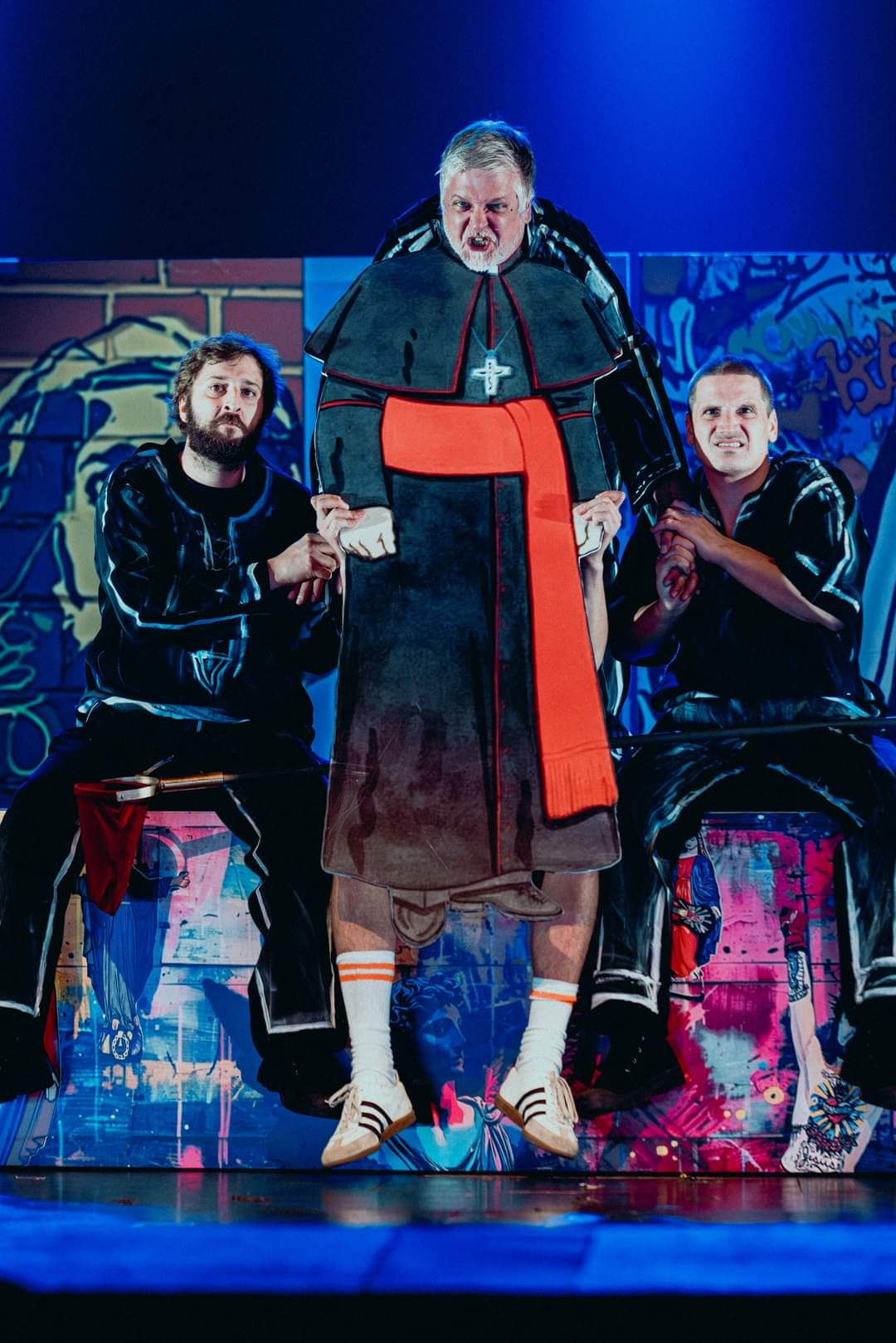 Kako je cijela država/nacija/regija/svemir glup(a), a samo je Robi pametan, u borbi s pseudoreligijskim kultom obračunali su se Robi i poduzetni prijatelji i s religijom. Kao najbolja metoda zastrašivanja sve glupe i neprogresivne dječice pokazao se vjerski plot twist, Robi i ministranti u epizodi „Gospe od drvarnice“. Na zidu ogroman mural pape Franje, Gospe, Isusa (Mesije) i Lionela Messija – jer kako drugačije graditi humor nego na homonimiji! Kako inovativno! Ono kad se nominativ Mesija i genitiv Messija rimuju! Evo, i sad se smijem! Kerempuh je inovaciju godine Gospodnje 2019., a u izvedbi za HNK Split 2023., gradio na pošalici o bogovskom biću Livaji, jučer se meštri inovacije dosjetiše „O Isusa na nebesu“ koji „daj-pomaže-bijelom-dresu“. Stipe Jelaska u Hajdukovu dresu (onako kako su kerempuhovci prije 4 godine i godine i pol u ovom istom HNK-u glumili hrvatske iseljenike – također u dresovima) glumi majku Božju koja na šatrovačkom latinskom koji završava s „emptis džepis“ uzima djeci slatkiše neodoljivo podsjeća na svoju, vidi vraga, istu ulogu Gospe u „Tako nam Bog pomogao“. Kapuljača je, notirajmo, bila drugačija jučer. Samo što je u Korbarovoj „Tako nam Bog pomogao“ satira zbilja bila fino ispolirana satira, a ne blatna invektiva.