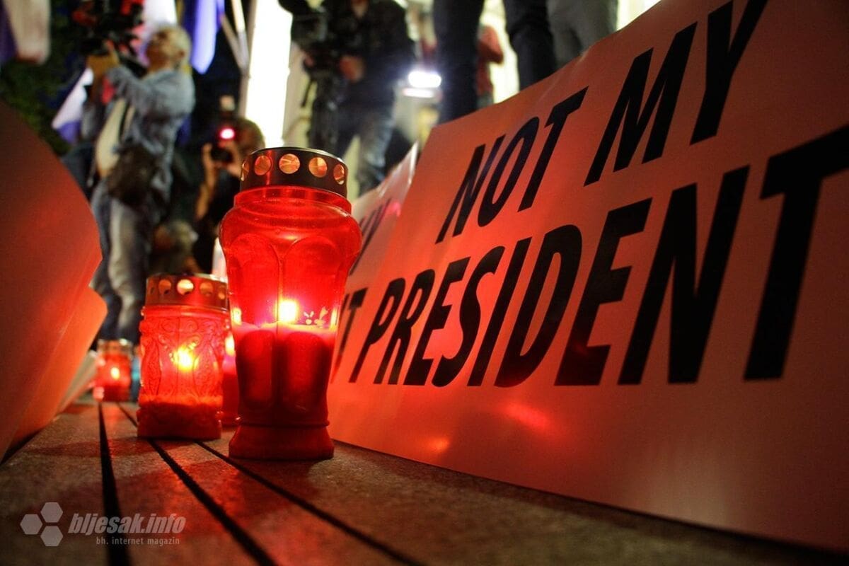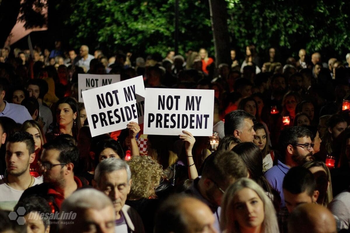 U Mostaru je u četvrtak navečer održan prosvjed protiv izbora Željka Komšića za hrvatskog člana Predsjedništva BiH. S prosvjeda, na kojem je sudjelovalo nekoliko tisuća Hrvata, poslane su poruke kako je demokracija umrla, te kako Komšić nije njihov predsjednik.