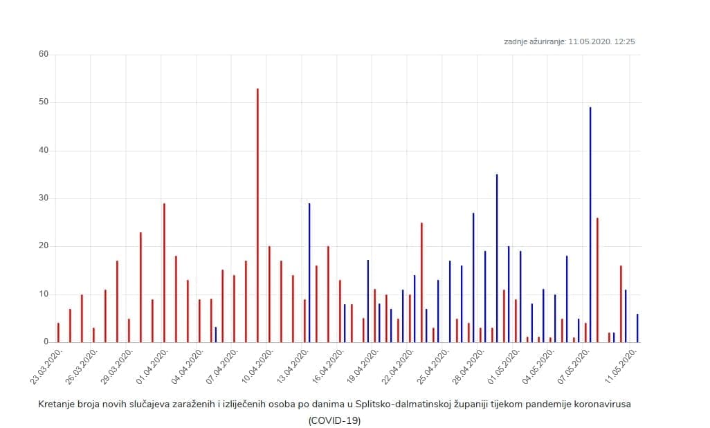 U odnosu na dodatak priopćenja od 10.05.2020. (nedjelja), prema izvješću NZJZ – a Splitsko dalmatinske županije od ukupno 195 obrađenih testova sa područja Splitsko dalmatinske županije, na dan 11.05.2020. (ponedjeljak) nema novooboljelih osoba.