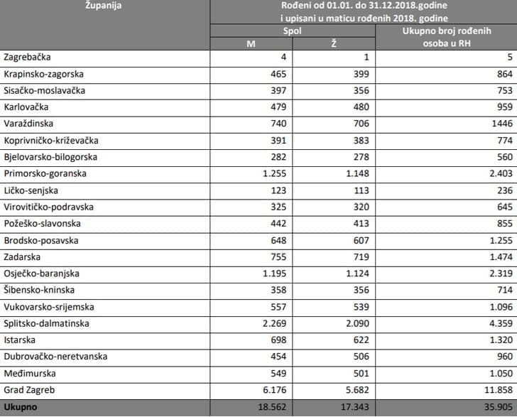 Najviše je djece rođeno i upisano u matične knjige u gradu Zagrebu, njih 11.858, a najmanje u Zagrebačkoj županiji, njih svega pet, no Zagrebačka županija nema rodilišta, pa su gotovo sva djeca rođena i upisana u Zagrebu. Po broju djece upisane u matice rođenih u 2018. godini slijedi Splitsko-dalmatinska županija (4359), zatim Primorsko-goranska (2403), Osječko-baranjska (2319), a na petom je mjestu Zadarska županija s 1474 djece, javlja portal Gradonačelnik.hr.