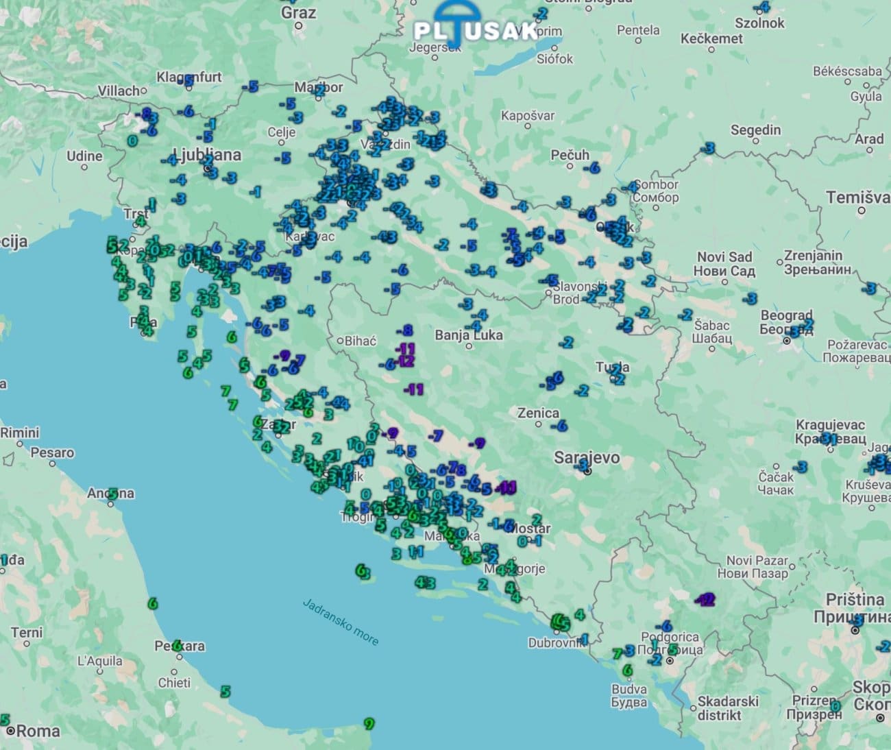 Hvar je mjerio 12, Komiža 11, Dubrovnik, Ploče, Kaštela, Zadar i Šibenik 10°C itd.