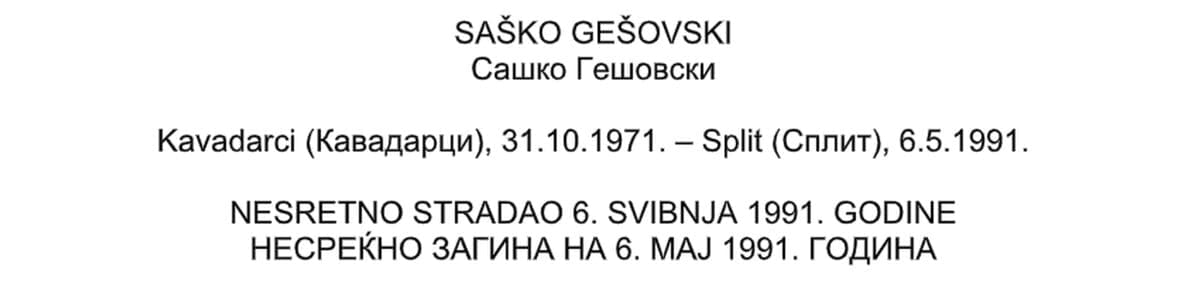 [Plavo]Saško Gešovski, rođen 31. listopada 1971. godine u makedonskom gradu Kavadarci. Tragično je preminuo u Splitu 6. svibnja 1991. godine. Gešovski, koji je služio vojni rok u Jugoslavenskoj narodnoj armiji (JNA) postao je prva žrtva oružanih sukoba koji su predviđali početak Domovinskog rata. Njegova smrt dogodila se usred politički napetog i emotivno nabijenog trenutka u Splitu u kojem su tenzije između hrvatskih građana i vojske JNA dosegle vrhunac.