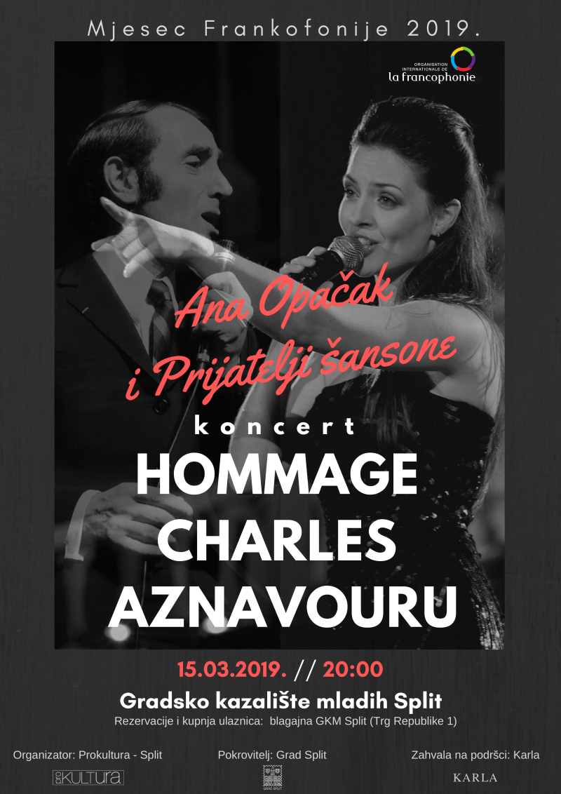Kako u svijetu tako i u Hrvatskoj, u ožujku se već tradicionalno obilježava Mjesec Frankofonije. Prokultura – Split i ove godine organizira bogati program, a najzanimljiviji događaj zasigurno je glazbena večer posvećena posljednjem velikanu francuske glazbene i umjetničke scene, pjevaču, glumcu, skladatelju, tekstopiscu i pjesniku Charlesu Aznavouru preminulom krajem prošle godine u 94. godini života.