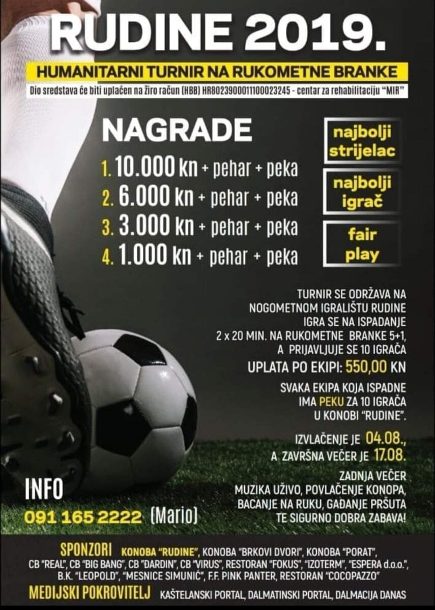 Konoba Rudine organizira humanitarni nogometni turnir gdje će dio sredstava ići za Centar ''Mir'' u Rudinama. Svi zainteresirani mogu se prijaviti do 4. kolovoza kada slijedi izvlačenje ekipa. Turnir se održava na nogometnom igralištu u Rudinama. Igra se po principu ispadanja 2 x 20 min. na rukometne branke , a prijavljuje se 10 igrača. Svaka ekipa koja ispadne ima peku u konobi Rudine . Završna večer je 17. kolovoza gdje će uz finale biti i povlačenje konopa, bacanje ruku, gađanje pršuta te muzika uživo. Svi zainteresirani mogu se javiti na broj mob. 091 165 2222( Mario).