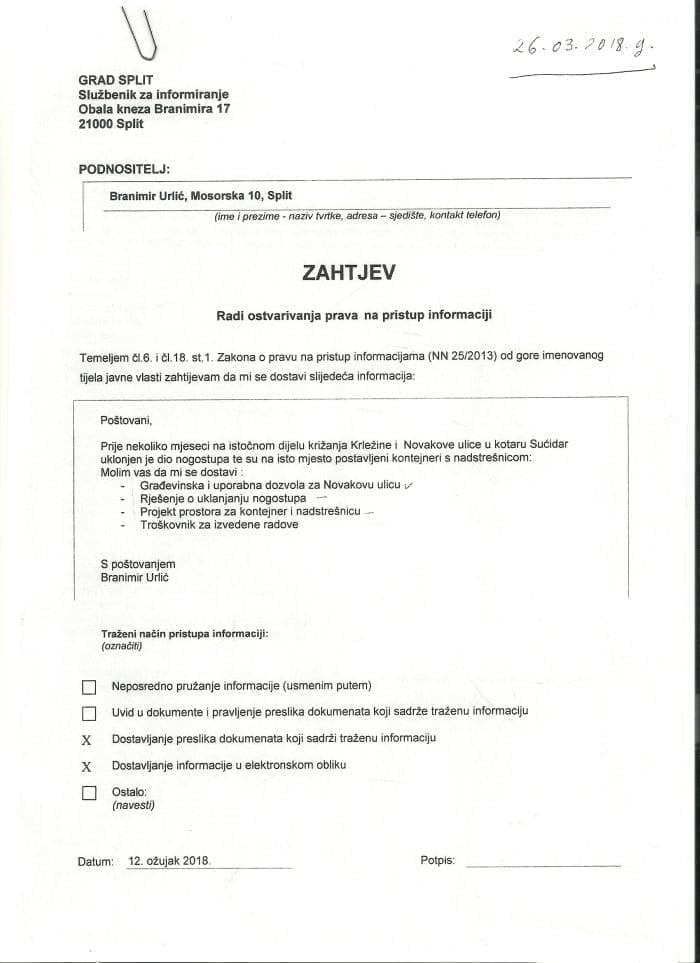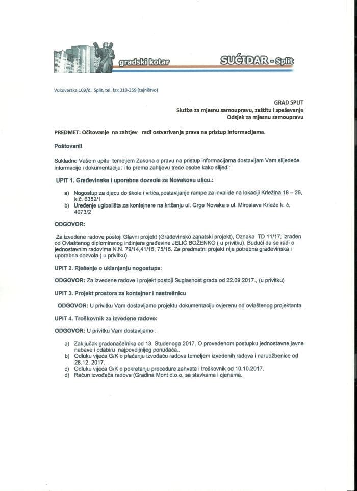 Tako je Damir Ćosić Roda, jedan od najpoznatijih kotarskih čelnika u Splitu, pokušao riješiti odlaganje otpada na nekim lokacijama na zadovoljstvo svih, ali je naišao na neodobravanja pojedinih stanara u Novakovoj i Katunarićevoj. U prvoj je pak prozivan kako je građanima odsjekao dio nogostupa da bi napravio ugibalište za kontejnere. Ta prozivka je činjenica, pa ni sam Roda od nje pribjegava, ali prilaže i svu dokumentaciju na račun koje je napravljeno sada uređen prostor na početku i vrhu ulice za kontejnere. S druge strane, logika stvari nalaže i gledanje šire slike, pa kada samo dođete u Novakovu primijetit ćete da su automobili parkirani duž ulice na nogostupu. Tko je god prolazio tom ulicom prije izgradnje novih prostora za odlaganje otpada u kontejnere sjetit će se da se ni onda nije od otpada moglo prolaziti tim odsječenim nogostupom upravo zbog neodgovornog odlaganja otpada.