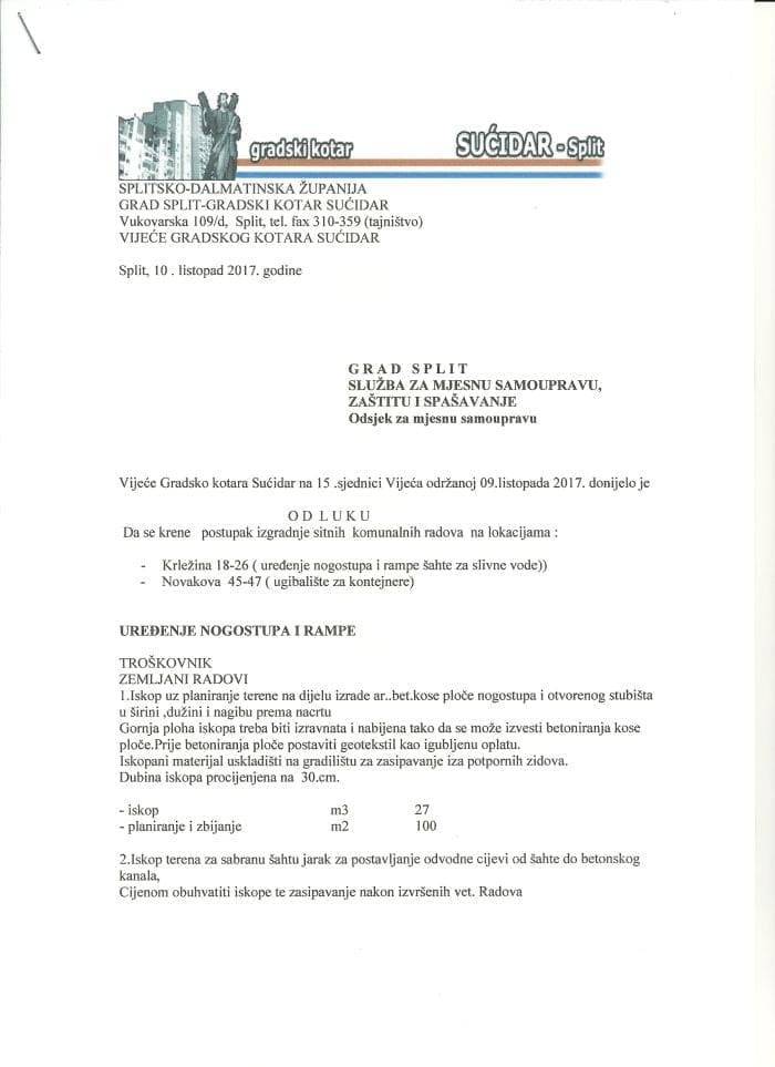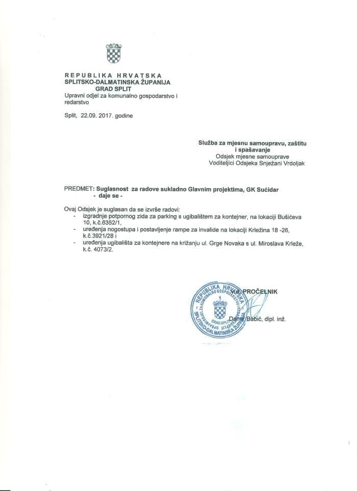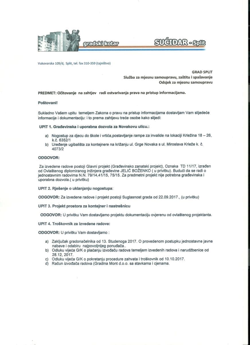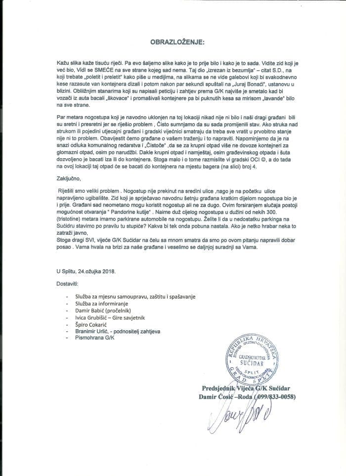 - Vlasnici privatnih kuća nisu željeli rasprave, niti čekati službeno rješenje problema, već su preko noći srušili izgrađenu konstrukciju i sve vratili u prvobitno stanje. Takvo stanje nastavilo se i danas te su stanari plave kuće i privatnih kuća i dalje u sporu. Kao predsjednik kotara, a zajedno s predstavnicima "Čistoće", nekoliko puta smo održali sastanke sa "zaraćenim stranama", nudili rješenja i tražili njihove prijedloge. Međutim dogovor je izostao, te je uređeni i plaćeni objekt za odlaganje smeća ostao srušen i neupotrebljiv. O cijelom događaju obavijestili smo policiju, te pokušali riješiti spor između stanara kako bi odlaganje smeća bilo riješeno na najbolju mogući način. Unatoč našem trudu, mom osobnom zalaganju mene kao predsjednika kotara, te djelatnika Čistoće, stanari odbijaju riješiti spor, a mi smo, dok se ne riješe imovinsko-pravni odnosi, ograničeni u daljnjem djelovanju. Na kraju volio bih napomenuti da se navedeni problem može riješiti jedino dogovorom stanara navedene zgrade i vlasnika privatnih kuća što smo nebrojeno puta i pokušali – zaključio je čelnik kotara Sućidar, Damir Ćosić Roda, i priložio nam nekoliko fotografija postojećeg stanja i stanja s izgrađenim objektom za kontejner 2013. godine.