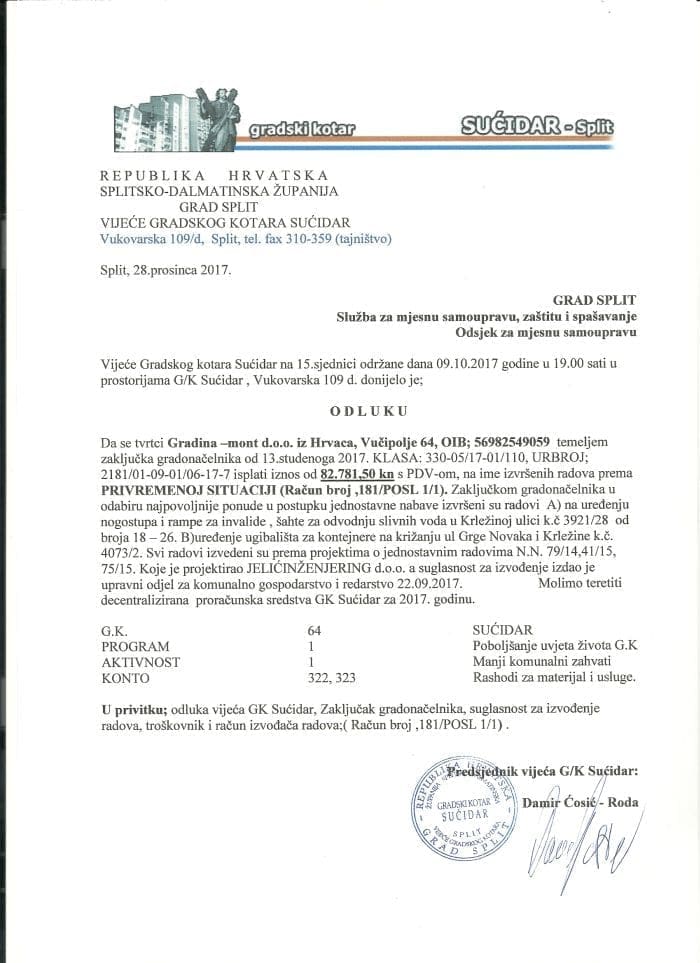 2011. godine izgrađena je "plava zgrada" u Katunarićevoj ulici na Sućidru, koja je u sklopu građevinske i uporabne dozvole dobila ograđeni prostor za kontejner u Martićevoj ulici. 2013. na zahtjev stanara "plave zgrade" na postojećem ugibalištu napravljena je metalna konstrukcija te limeni krov i željezna vrata s katancem za stanare zgrade. No, stanari u okolnim privatnim kućama iz Martićeve prosvjedovali su protiv kontejnera u ugibalištu, smatrajući da se nalaze na njima neprihvatljivom mjestu te zatražili uklanjanje prostora za odlaganje smeća. Roda nam kaže kako je potom zatražio od izvođača svu dokumentaciju za sporno ugibalište, a ona je potvrdila izgrađeno. oDLUKA VIJEĆA gk Sućidar