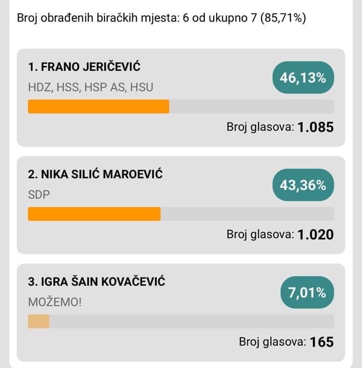 Jeričević trenutno ima 46,13% glasova, dok Silić Marović ima 43,36%. Iz igre ispada Možemovka Igra Šain Kovačević koja je na izborima osvojila 7% glasova.
