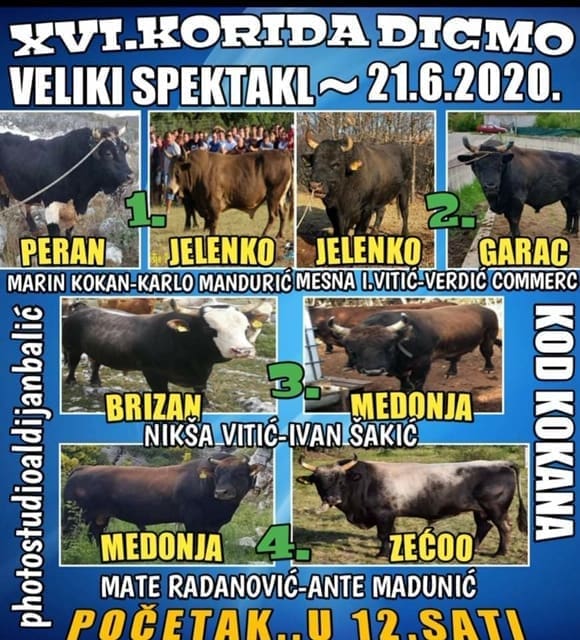 U Dicmu će se nakon smirivanja Covid 19 krize i uz poštivanje nacionalnih mjera zaštite, ove nedjelje održati 1. “Korida”. Gospodarska zona Dicmo će, s početkom u 12 sati, ugostiti atraktivne borbe bikova, uključujući udarnu borbu za šampiona poluteške kategorije, u kojoj će snagu odmjeriti Peronja u vlasništvu braće Kokan i Jelenko, u vlasništvu Karla Mandurića.