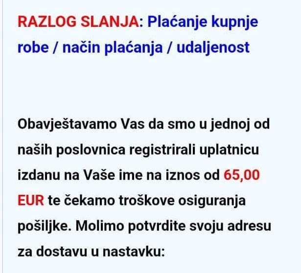 "Javio mi se kupac zainteresiran za proizvod koji sam stavio na oglas. Malo mi je bilo čudno što je tražio dodatne fotografije, iako sam ih preko 20 stavio u oglas. Ali sve ok. Dogovorimo mi primopredaju. Služba će donijeti novac, a ja predajem paket", priča naš čitatelj kojem se na prvu činilo sve ok, sve dok nije stigla poruka da treba uplatiti 50 eura za osiguranje paketa.
