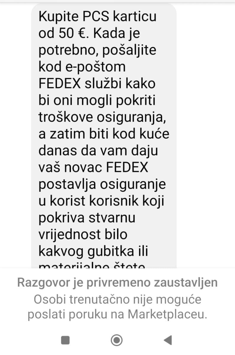 "Dolazim iz grada Krka pa koristim FedEx ekspresnu dostavu poštara. Službenik će doći u vašu kuću da vam da kovertu u kojoj se nalazi novac, kada ga preuzmete, dajte mu proizvod koji će mi dostaviti", navlačio ga je lažni kupac.