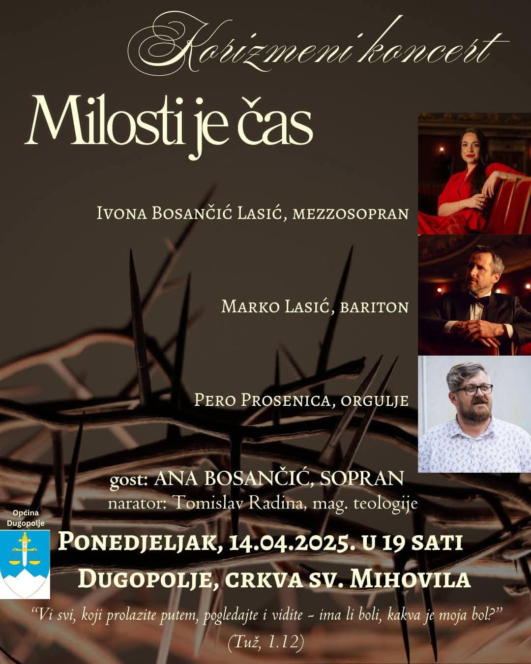 Korizmeni koncert "Milosti je čas" održat će se u ponedjeljak (14. travnja) u 19 sati u Dugopolju, u crkvi sv. Mihovila.
