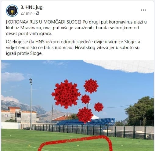 Na stranicama 3. HNL Jug objavili su da je virus Covid 19 ušao u NK Slogu iz Mravinaca.