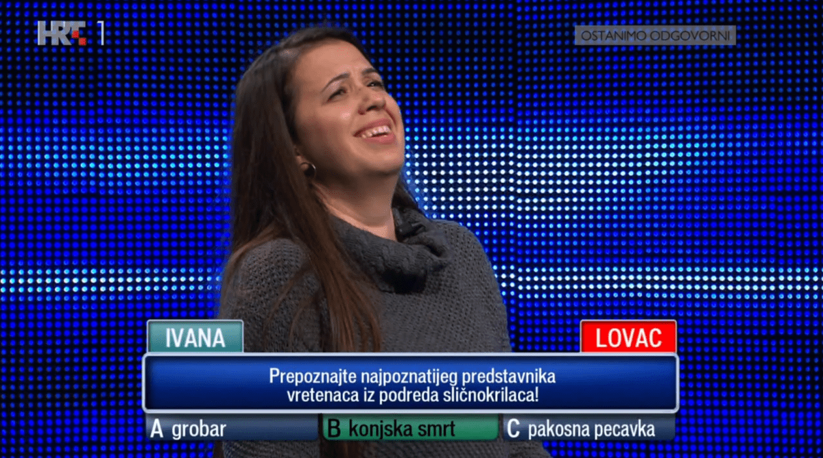 Lokas je pročitao prvo pitanje na ploči, koje je bilo vezano za životinjski svijet i glasilo je: "Prepoznajte najpoznatijeg predstavnika vretenca iz poreda sličnokrilaca." Ponuđeni odgovori bili su grobar, konjska smrt i pakosna pecavka.