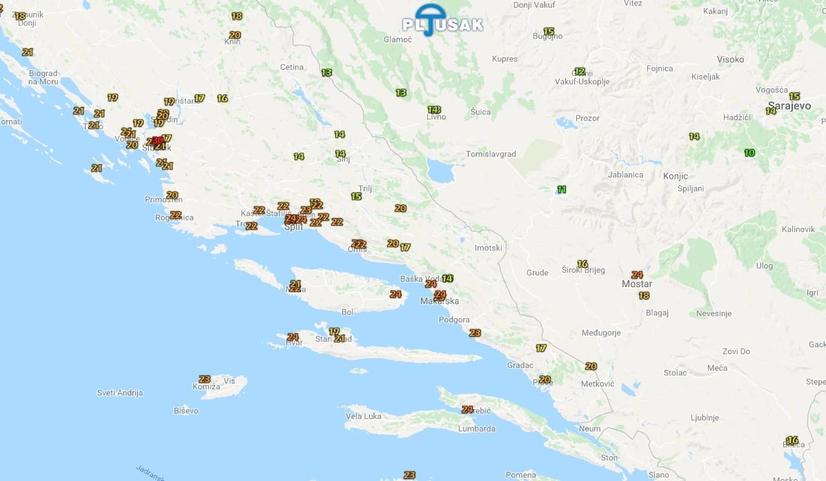 Jutarnja svježina danas se mogla osjetiti samo u dijelovima Dalmatinske zagore. Tako su u većem dijelu Cetinske krajina minimalne jutarnje temperature zraka bile oko 14°C. Čak 10 stupnjeva više bilo je na nekim srednjodalmatinskim otocima.