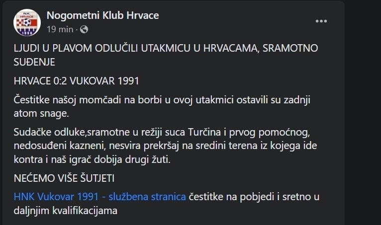 Nakon utakmice su se domaći oglasili priopćenjem. Nezadovoljni su suđenjem...