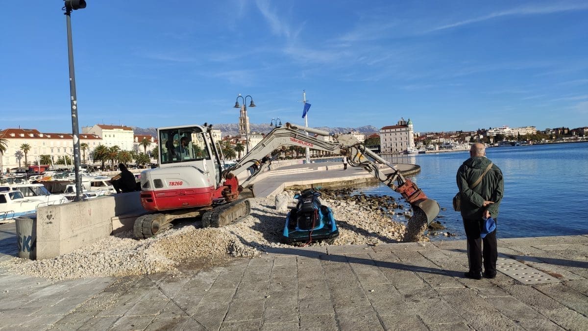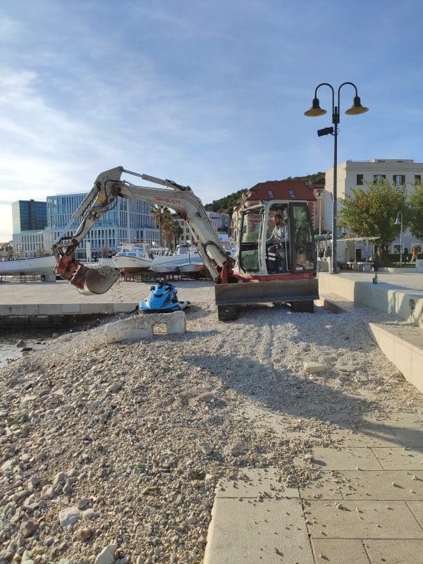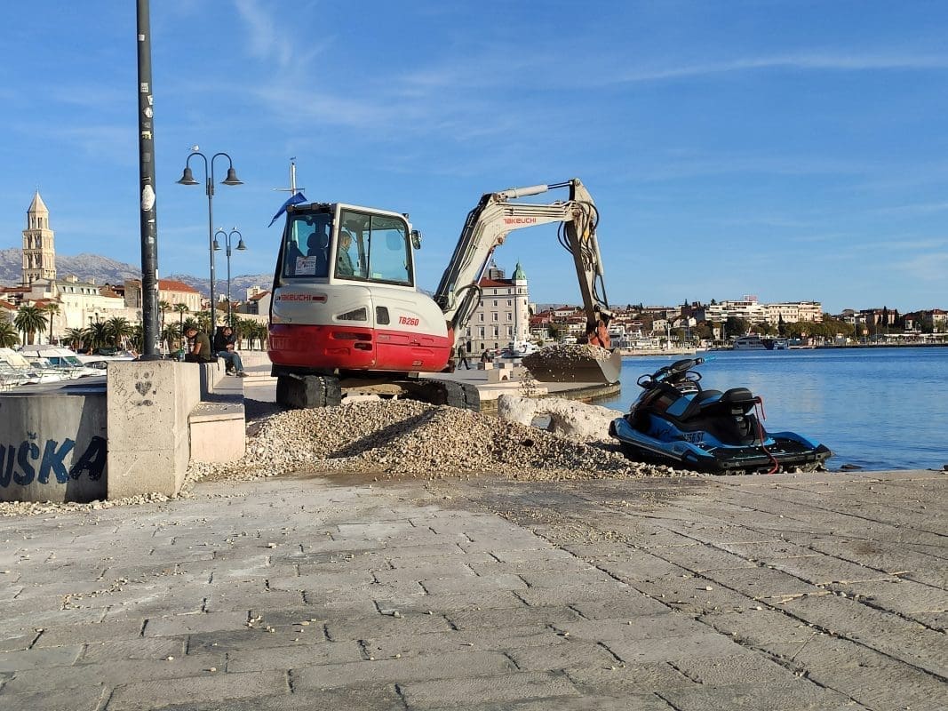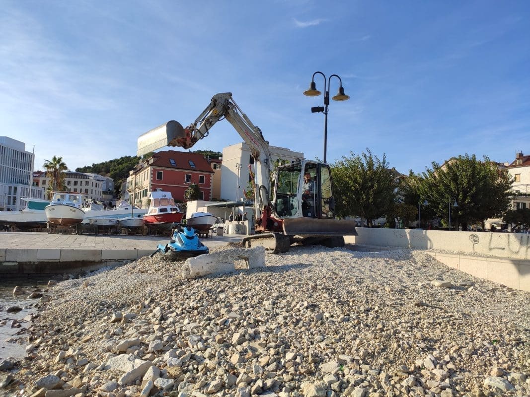Podsjetimo, uslijed jakog kišnog nevremena popraćenog jakim jugom koje je u ponedjeljak zahvatilo Dalmaciju, na potezu od Firula do POŠK-a stvorili su se nanosi žala. I danas, kao i jučer, bagerista marljivo radi na sanaciji spomenutog. Tako je i na Matejušci.