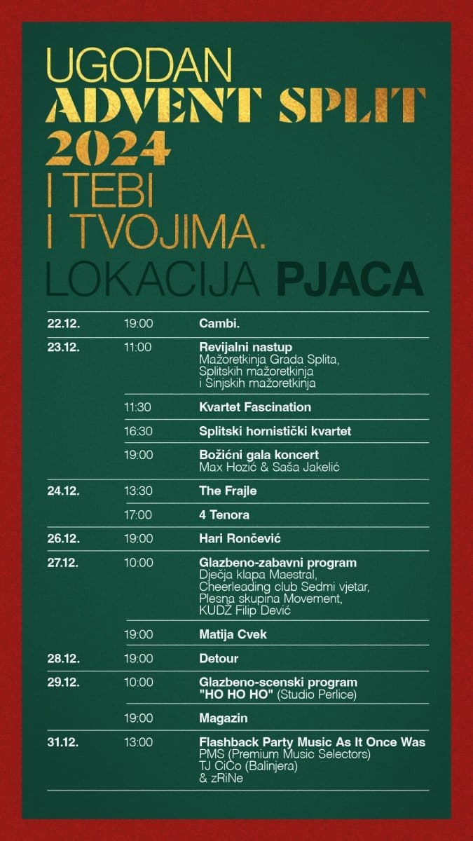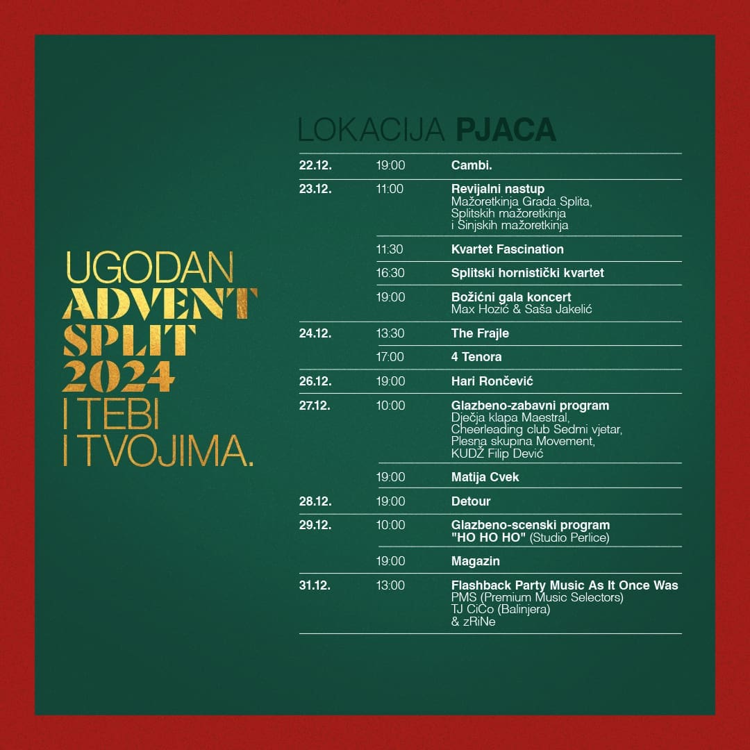 Pjaca je, dakle, ovog adventa mjesto gdje se svi susreću – od glazbenih legendi, lokalnih izvođača, do svih onih koji žele uživati u ugodnoj, splitskoj atmosferi. Bez obzira na to dolazite li iz Splita ili ste u posjeti, Pjaca vas dočekuje kao svoju, i u njoj možete osjetiti pravu čaroliju adventskog Splita.