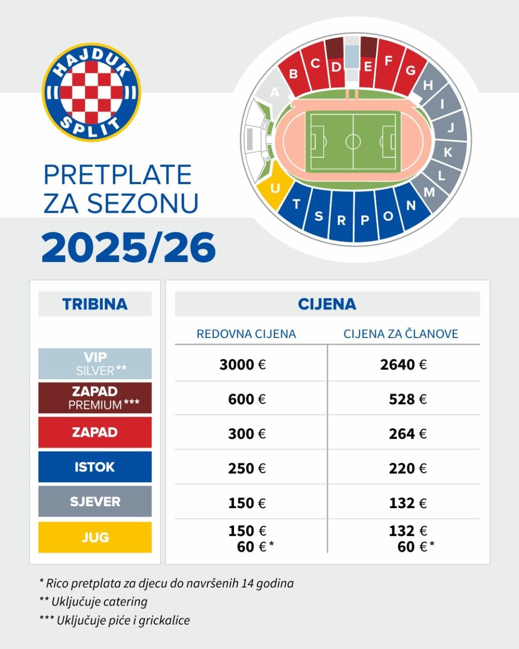 U ponedjeljak, 23. lipnja od 10 sati kreće prodaja sezonskih pretplata za natjecateljsku sezonu 2025./2026. Prva dva tjedna, od 23. lipnja do 7. srpnja traje razdoblje u kojem prošlosezonski pretplatnici mogu obnoviti svoje pretplate te imaju mogućnost promijeniti svoje mjesto za mjesta koja su u tom trenutku dostupna. U istom razdoblju, postojeći pretplatnici mogu, osim mjesta, promijeniti i tribinu birajući mjesta koja su dostupna na drugoj tribini.