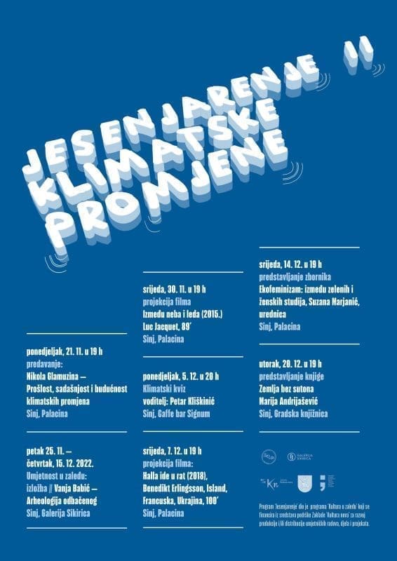 Sutra, u ponedjeljak 21. 11. u 19 sati u zgradi Palacine, započinje treće izdanje Jesnjarenja. Program je nastao u suradnji udruge Sinjski kulturni urbani pokret i Galerije Sikirica, s ciljem da se kroz različite forme – izložbe, filmske projekcije, stručna predavanja, razgovore s autorima – publici približe određena kompleksna pitanja i aktualna društvena problematika, a tema ovogodišnjeg izdanja su klimatske promjene.