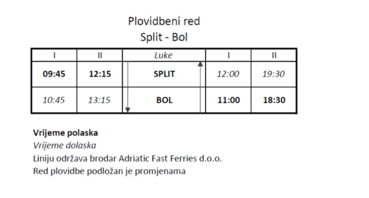 Dana 17.06., brodar Adriatic Fast Ferries d.o.o. počeo je s održavanjem sezonske brzobrodske linije od Splita prema Bolu na Braču. Linija se održava katamaranom Adriatic Express s dvije plovidbe dnevno: polasci u 09:45 i 12:15 iz splitske gradske luke te u 11:00 i 18:30 iz luke Bol.
