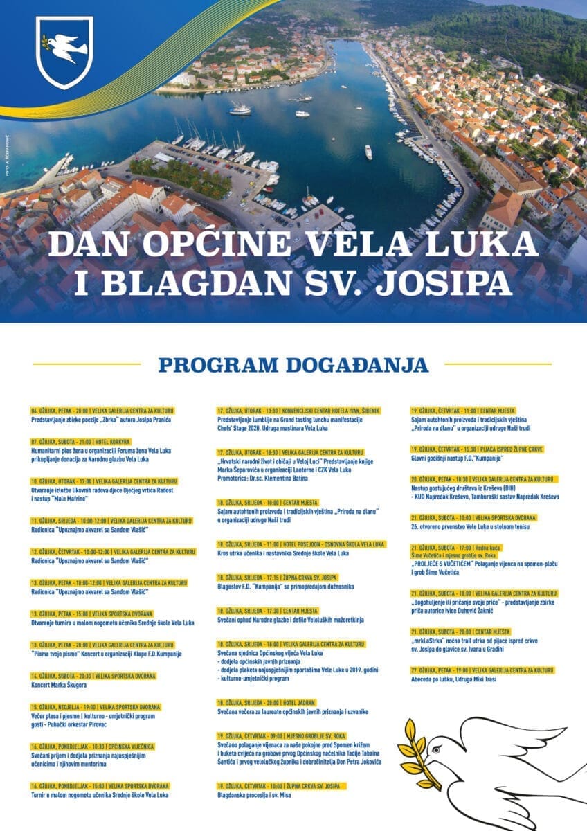 - Donosimo vam cjelokupan program proslave, a ovom prilikom pozivamo sve Velolučane i naše drage goste da nam se pridruže i zajedno s nama proslave Dan općine Vela Luka i blagdan sv. Josipa - poručuju organizatori!