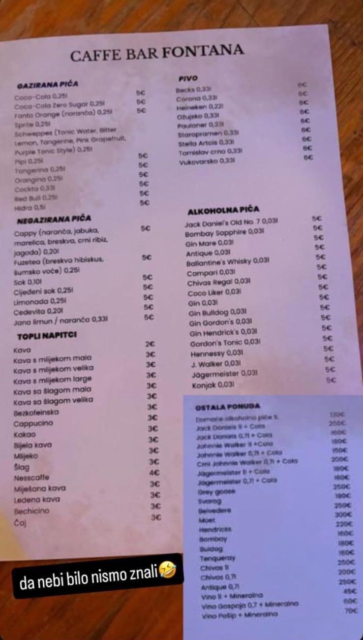 Na fotografiji se vide standardna pića po, za mnoge, neuobičajeno visokim cijenama – gazirani i negazirani sokovi, voda, kava i pivo po 5 eura, a ista cijena vrijedi i za većinu alkoholnih pića od 0,03 l. Kava s mlijekom kreće se od 2 do 3 eura, a cjenik završava s “posebnim ponudama” boca alkoholnih pića koje idu i do 250 eura.