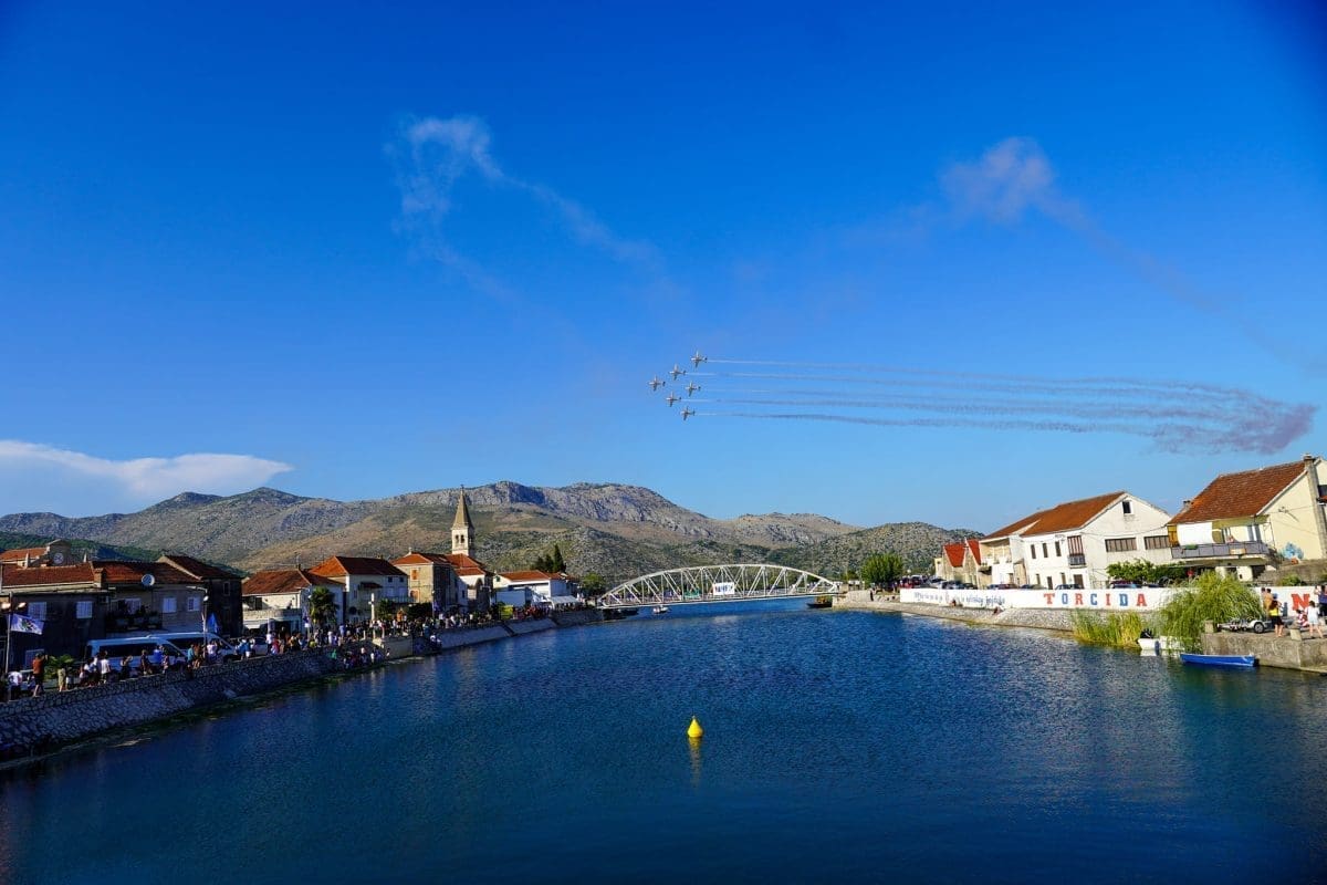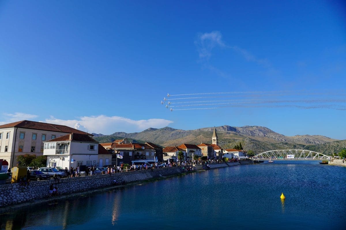 Letački program akrobatske grupe „Krila Oluje“ počeo je nešto prije 18 sati uoči brzinske trke, tradicionalnog adrenalinskog nadmetanja na kojemu se lađari bore za što bolje startne pozicije na Maratonu lađa.