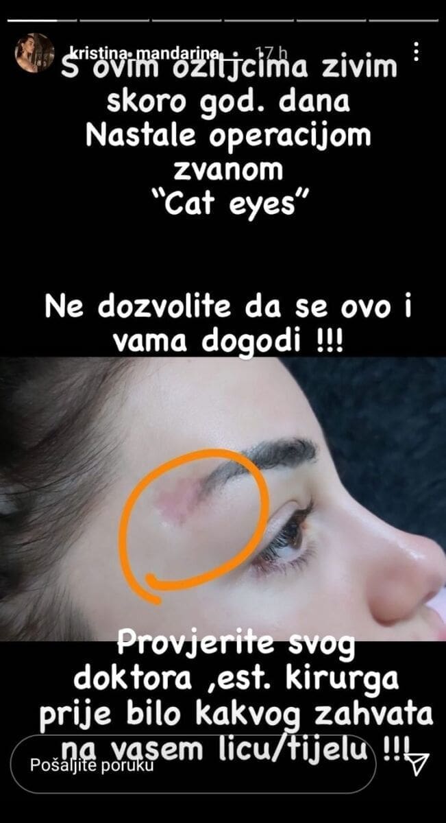 "S ovim ožiljcima živim skoro godinu dana. Nastali su operacijom zvanom 'cat eyes'. Ne dozvolite da se ovo vama dogodi. Provjerite svog estetskog kirurga prije bilo kakvog estetskog zahvata na vašem licu ili tijelu", napisala je uz fotografije.