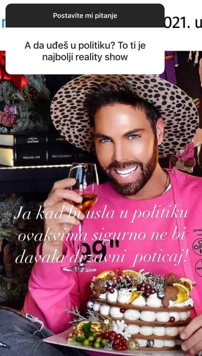 "A da uđeš u politiku? To ti je najbolji reality show", glasilo je jedno od pitanja. Kristina je odgovorila fotografijom Grubnića uz koju je napisala: "Ja kad bih ušla u politiku, ovakvima sigurno ne bih davala državne poticaj".