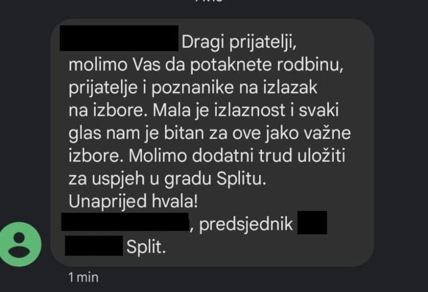 "Dragi prijatelji, molimo Vas da potaknete rodbinu, prijatelje i poznanike na izlazak na izbore. Mala je izlaznost i svaki glas nam je bitan za ove jako važne izbore. Molimo dodatni trud uložiti za uspjeh u gradu Splitu. Unaprijed hvala", sadržaj je poruke koju kruži i koja je navodno potpisana od strane čelnog čovjeka jedne splitske stranke.
