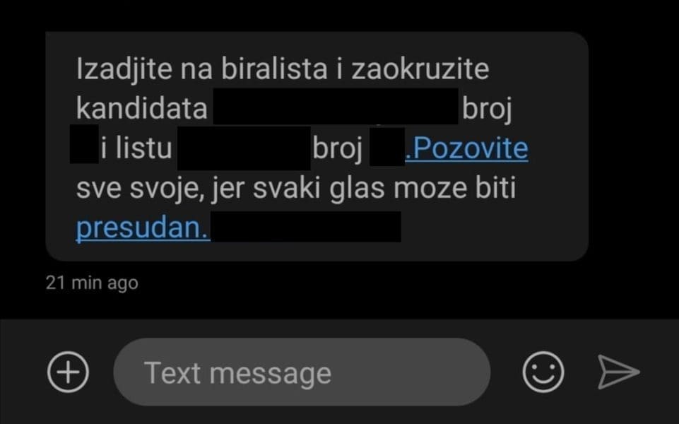 Napominjemo da su objavljeni screenshotovi cenzurirani tako da se ne vidi za koga se sugerira da se glasuje jer bi u tom slučaju i naša objava predstavljala oblik kršenje izborne šutnje.