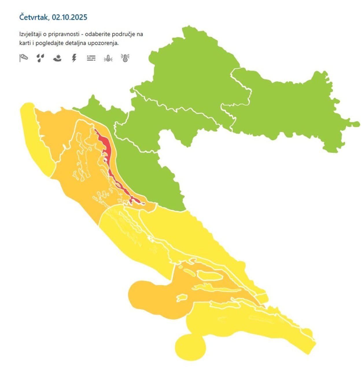 DHMZ je unutar sustava MeteoAlarm izdao žuto upozorenje za srijedu za cijeli Jadran zbog bure u jačanju. Za Podvelebitsko primorje izdan je narančasti stupanj. Za četvrtak se za dio Dalmacije podiže na narančasti stupanj, a podno Velebita na crveni. Naravno, sve zbog bure koja će podno Velebita imati orkanske udare, a drugdje olujne udare.