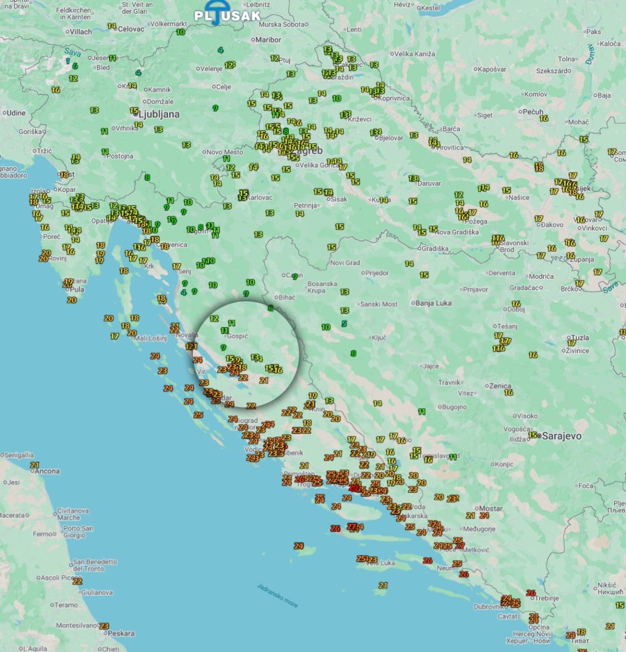 U Dubrovniku temperatura je dosegla 21,9 °C, dok su Knin (21,4 °C) i Lastovo (21,3 °C) također imali ugodan rujanski dan. Zemunik kraj Zadra zabilježio je 21,2 °C.