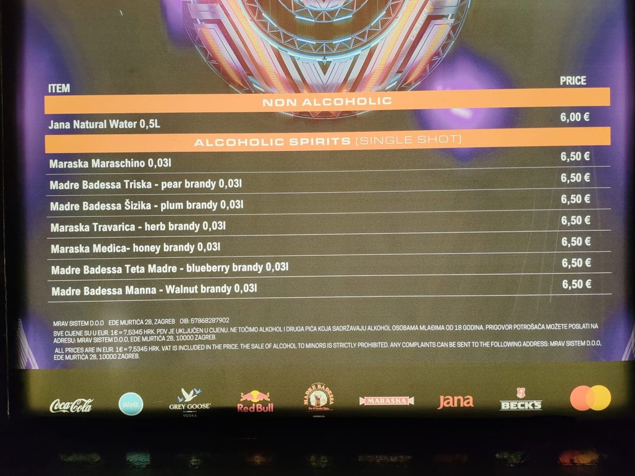 Na službenom cjeniku, osim nealkoholne Jane (0,5L) po cijeni od 6 eura, nalaze se razne voćne i biljne rakije iz asortimana Madre Badessa, sve po jednakoj cijeni od 6,50 eura za 0,03L. Ova cijena, iako nešto viša od standardnih barova, u potpunosti odgovara festivalskom ambijentu i ekskluzivnosti ponude.