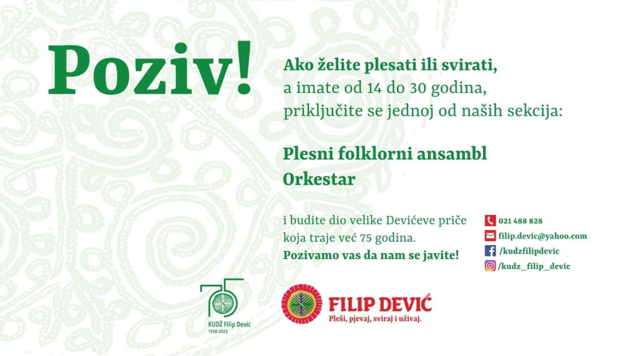 Svi zainteresirani mogu se prijaviti i postati dijelom ove velike kulturne obitelji. 'Filip Dević' ne samo da čuva tradiciju, već je i živi – pridruži se i budi dio ove glazbene i plesne priče!