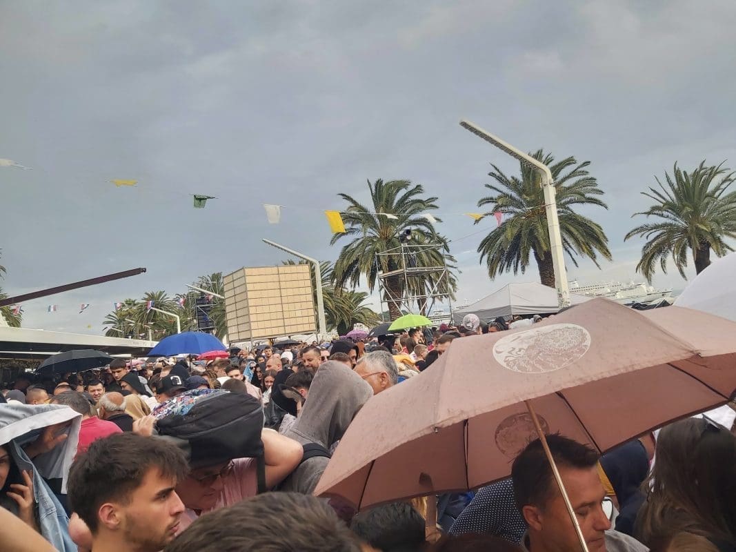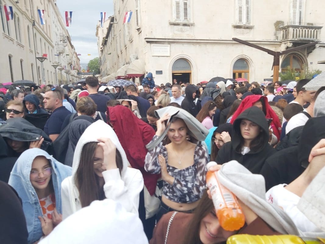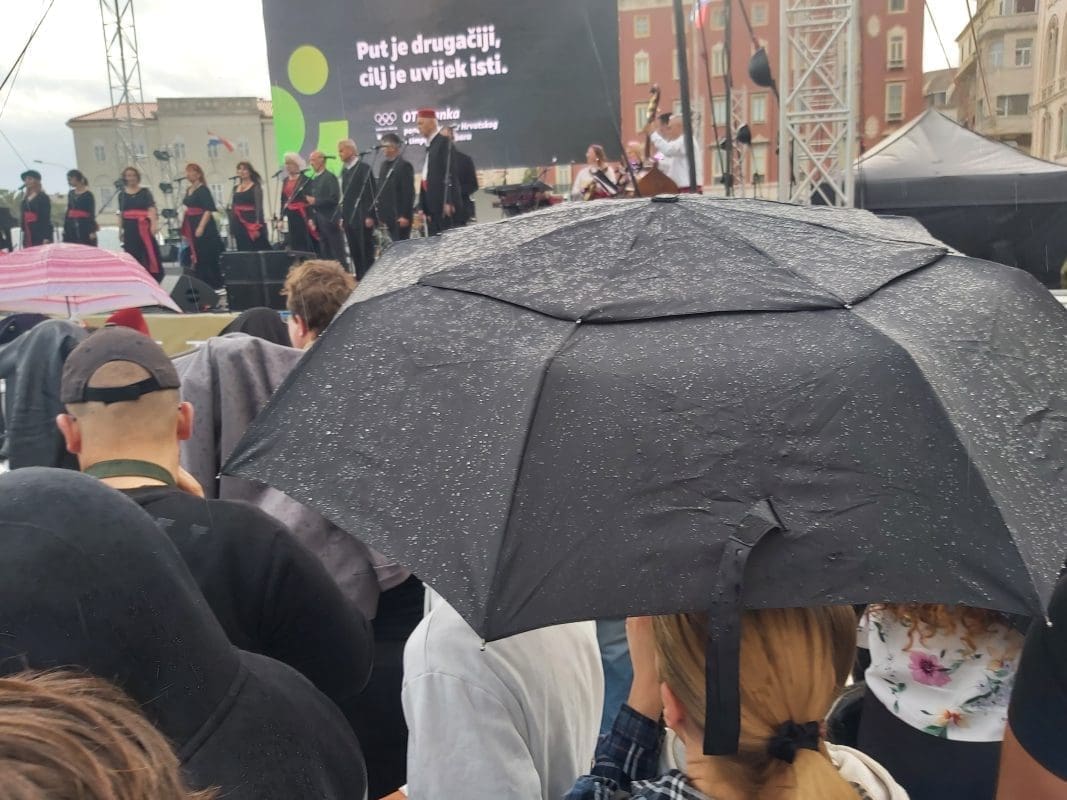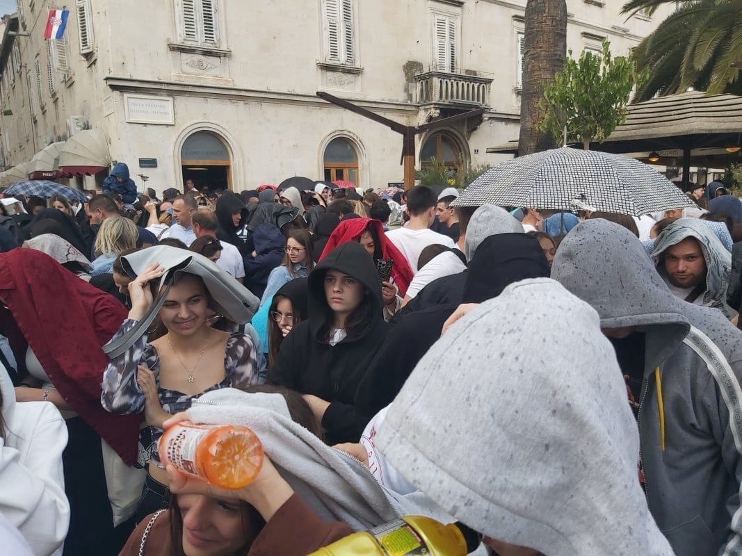 Svi se spremaju i za tombolu. Svugdje se traži kemijske više. No, odjednom je počela padati kiša, pa su se spremale naočale i vadili kišobrani. A mnogi su svoje sklonište tražili na Prokurativama.