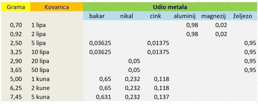 Od HNB-a nismo dobili podatak koliko je u apoenima od jedne kune ili pet kuna u tih 5.200 tona pa bi svaki izračun koliko nam kovanice kao sirovina vrijedi danas bilo prilično nagađajući. No, ako bi se ipak upustili u "odokativnu" metodu pa u izračun uvrstili da se radi o cca 60 posto bakra, 20 posto nikla i 12 posto cinka, po današnjim cijenama tih metala na tržištu bi se lako prodalo za 54 milijuna eura ili za 100 milijuna kuna manje nego što je jednom hrvatskom umirovljeniku iz okolice Šibenika leglo na bankovni račun prije koji mjesec i to, što bi se reklo, iz čista mira. Komad iskovane kune u prosjeku bi kao sirovina vrijedila 35 lipa.