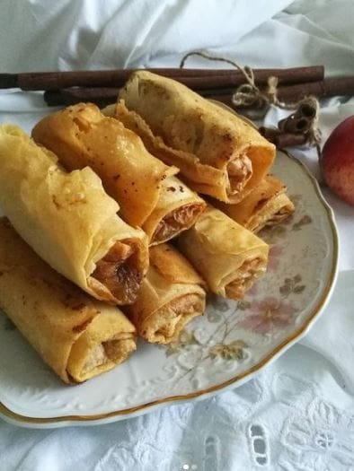 Naribane jabuke skupa sa šećerom dinstati dok voda ne ispari. Dodati vanilija šećer, cimet, rum i orahe i još kratko prodinstati. Ostaviti da se ohladi. Kore prerezati po dužini na pola, svaku polovicu namazati s malo ulja i posuti prezlom, pa na vrh svake kore staviti dvije žlice nadjeva.