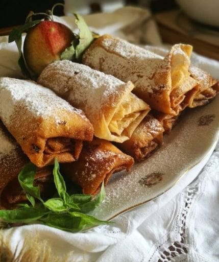 Zavrnuti rubove da nadjev ne iscuri, zarolati i sam rub možete prerezati bjelanjkom da se ne otvori prilikom friganja, mada nije nužno. U dubokom ulju, na srednjoj temperaturi ih isfrigati, dok ne dobiju lijepu rumenu boju. Gotove stavljati na kuhinjski papir da upije višak ulja. Poslužite ih tople s kuglom sladoleda po želji.