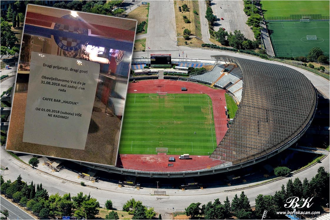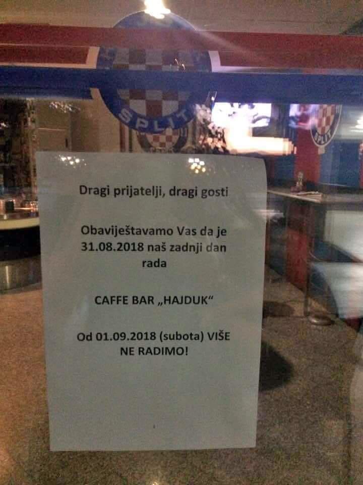 Na vratima caffe bara "Hajduk" na Poljudu u Splitu izvješena je obavijest da je 31. kolovoza 2018. posljednji radni dan ovog kafića.